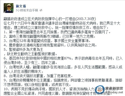施文儀31日在臉書po文,以「籲請政府速成立狂犬病防救指揮中心的一打理由」為題,指出第一隻陽性鼬獾是去年5月撿獲,已讓病毒在台多孕育了14個月,且根據病毒基因序列比對發現,與中國的相似度僅87%,顯示病毒在去年5月時,已入侵台灣至少3、4年,現已擴散到各縣市,非單一城市的危機。