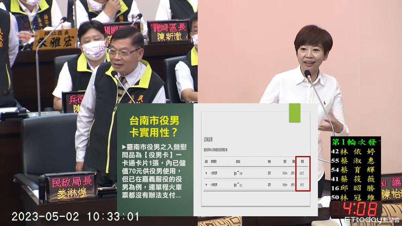 ▲台南市議員陳怡珍,認為市府提供役男的入營慰問品為「役男卡」內儲70元,連單程火車票都沒有辦法全額支付,還要自掏腰包補足車資,第一印象很差。(圖/記者林悅翻攝)