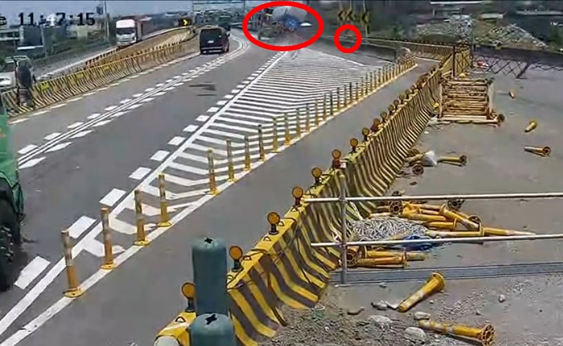透過監視器畫面可發現,槽車行駛到事發路段時,因不明原因靠右偏離車道,接著駕駛緊急煞車,車體隨即左右擺動,最後翻落機車道,事發當時一名機車騎士正行駛在機車道上,所幸車速並不快,沒有遭槽車壓住,命大逃過死劫。
