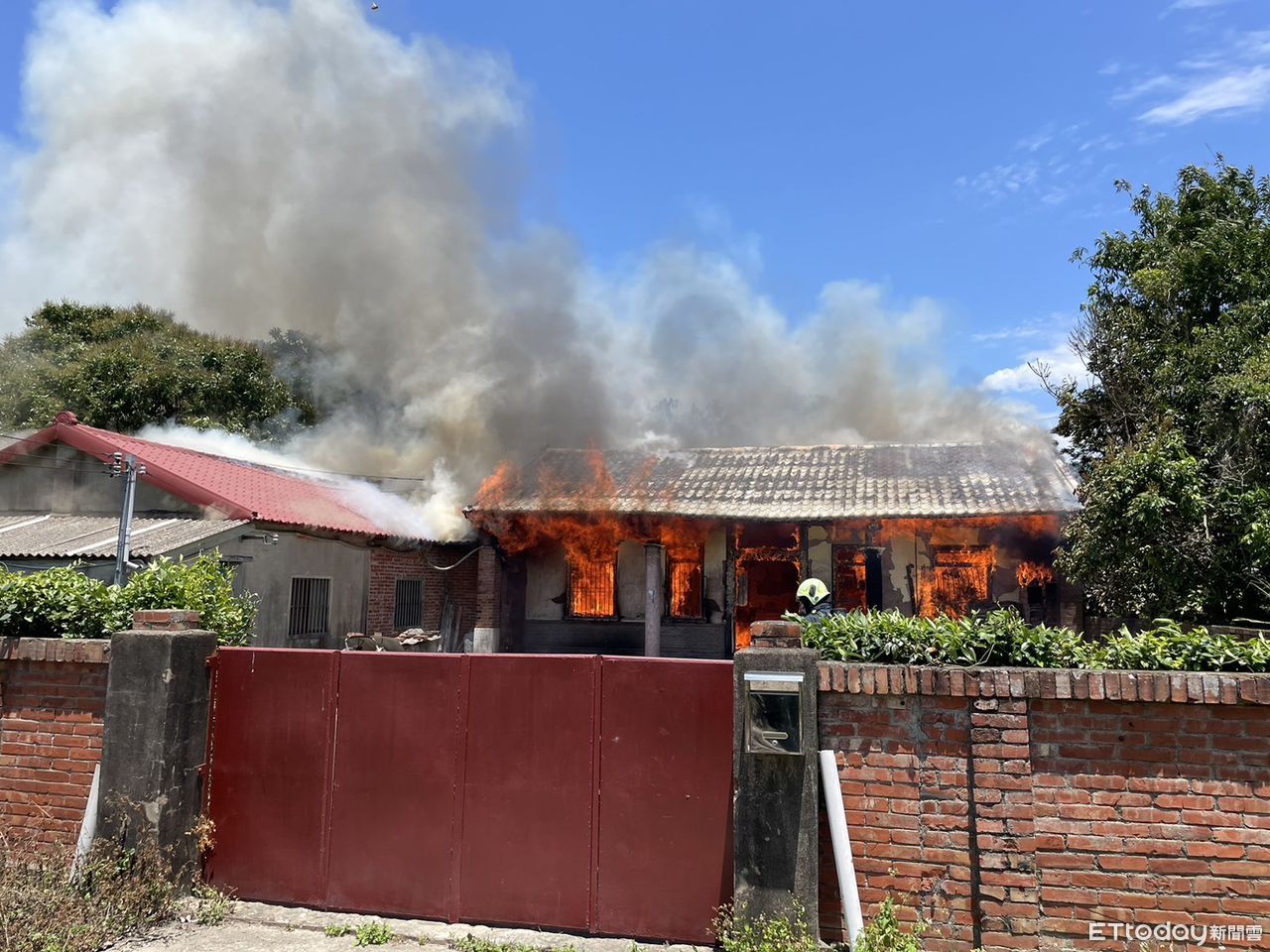 ▲苗栗縣公館鄉石墻村一處三合院5日中午發生火災,沒有人員受困,消防人員搶救中。(圖/記者蔡文淵翻攝)
