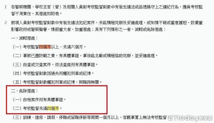 根據警界人事獎懲規定,有影響警譽且情節重大者,得加重懲處。但,考核監督未滿4個月以上,未滿6個月者,得減輕懲處。另,在「免除懲處」方面,考核監督未滿4個月者,得免除懲處。
