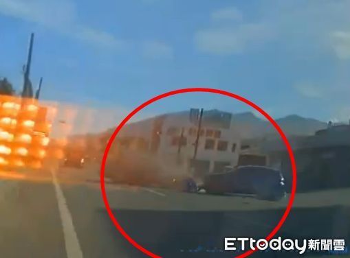 兩車對撞的驚險瞬間,對目擊駕駛的行車紀錄器錄下,目擊駕駛6日下午4時23分左右,駕駛開車行經台東太麻里路段,他遠遠看到一台藍色小客車要從左側路旁駛出,但沒想到對方竟要直接跨越雙黃線違規轉彎,當場就與同向自小客對撞,2車猛撞後整個噴飛旋轉,差點就往目擊者撞過來,但幸好他有所警覺、提早從內線車道切換到外側,逃過一劫。