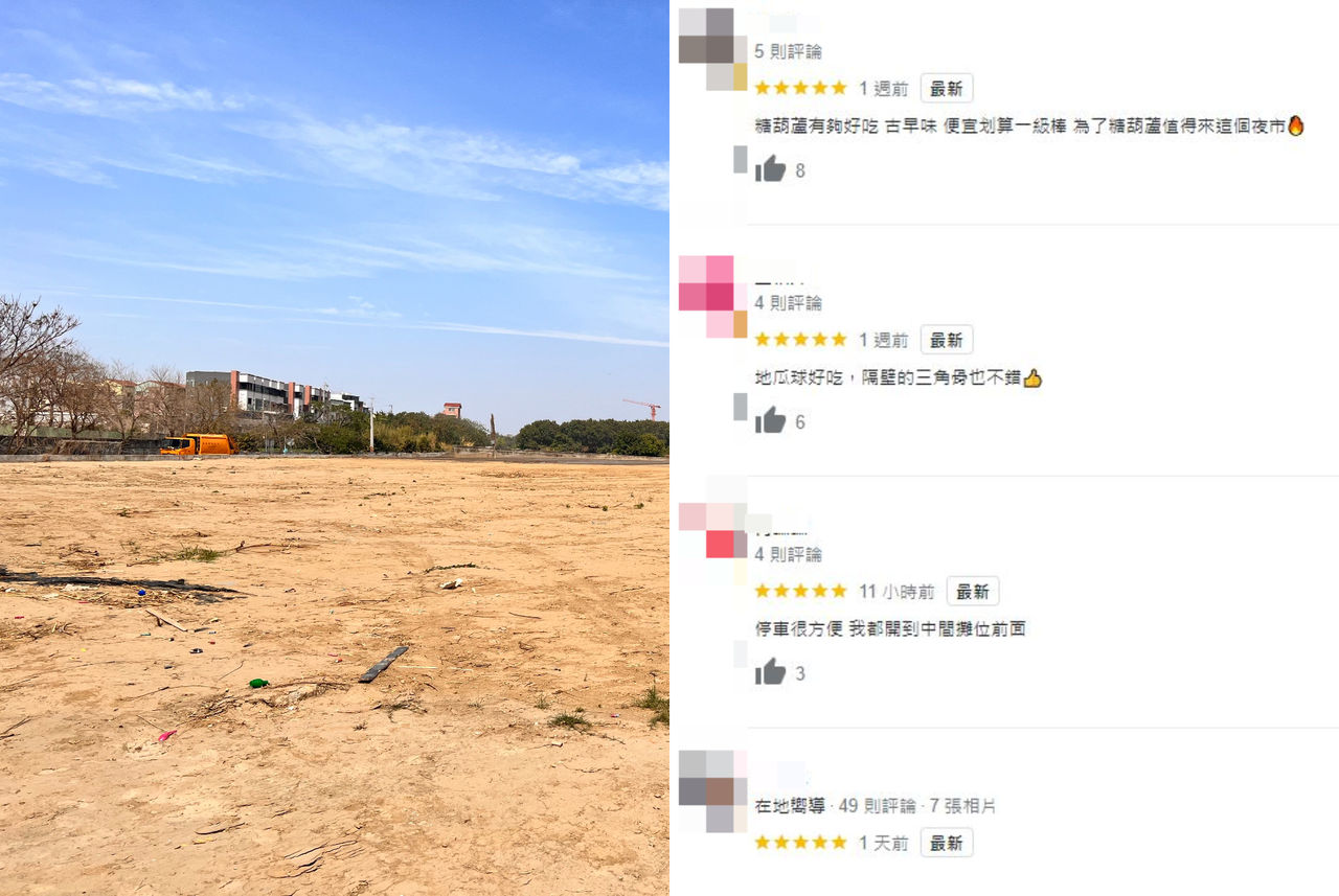夜市美食選擇多樣,每到晚餐時間總是湧入許多民眾。但嘉義西區的「湖子內夜市」明明還沒開幕,Google評論上面已經出現不少5星好評,還有人大讚「糖葫蘆有夠好吃」、「裡面的食物便宜又划算」等。結果有民眾到了現場才發現根本沒有攤販,驚覺上當反給1星負評,更罵「不要再騙了!」