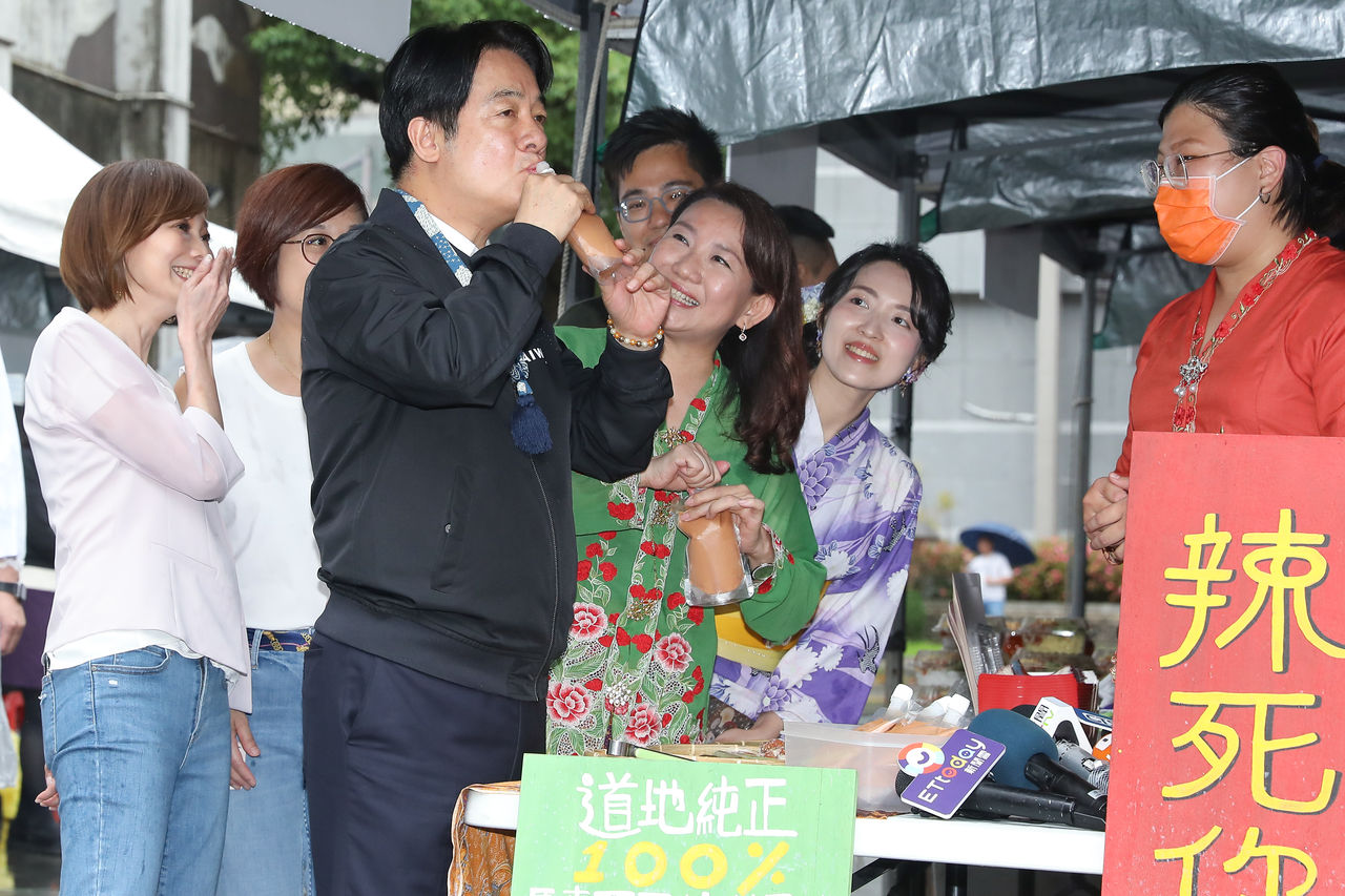 賴清德在致詞結束後,特別到園遊會和年輕朋友一起捲棉花糖,同時和現場的民眾及小朋友互動,並對娘惹糕、拉茶讚不絕口。