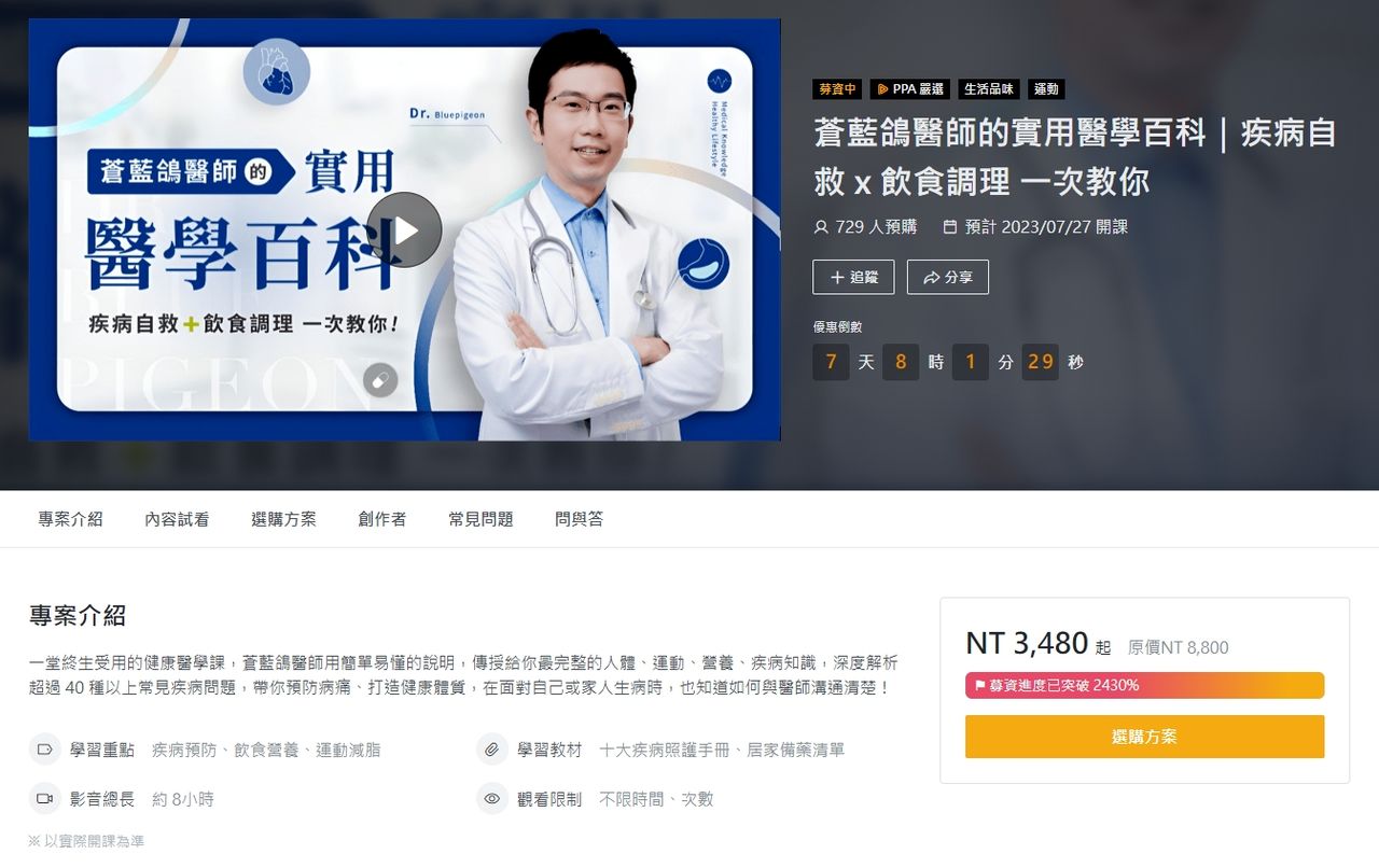 「蒼藍鴿醫師的實用醫學百科」原價8800元,預計7月27日開課,目前課程特價3480元,已有729人預購,募資進度已突破2430%。