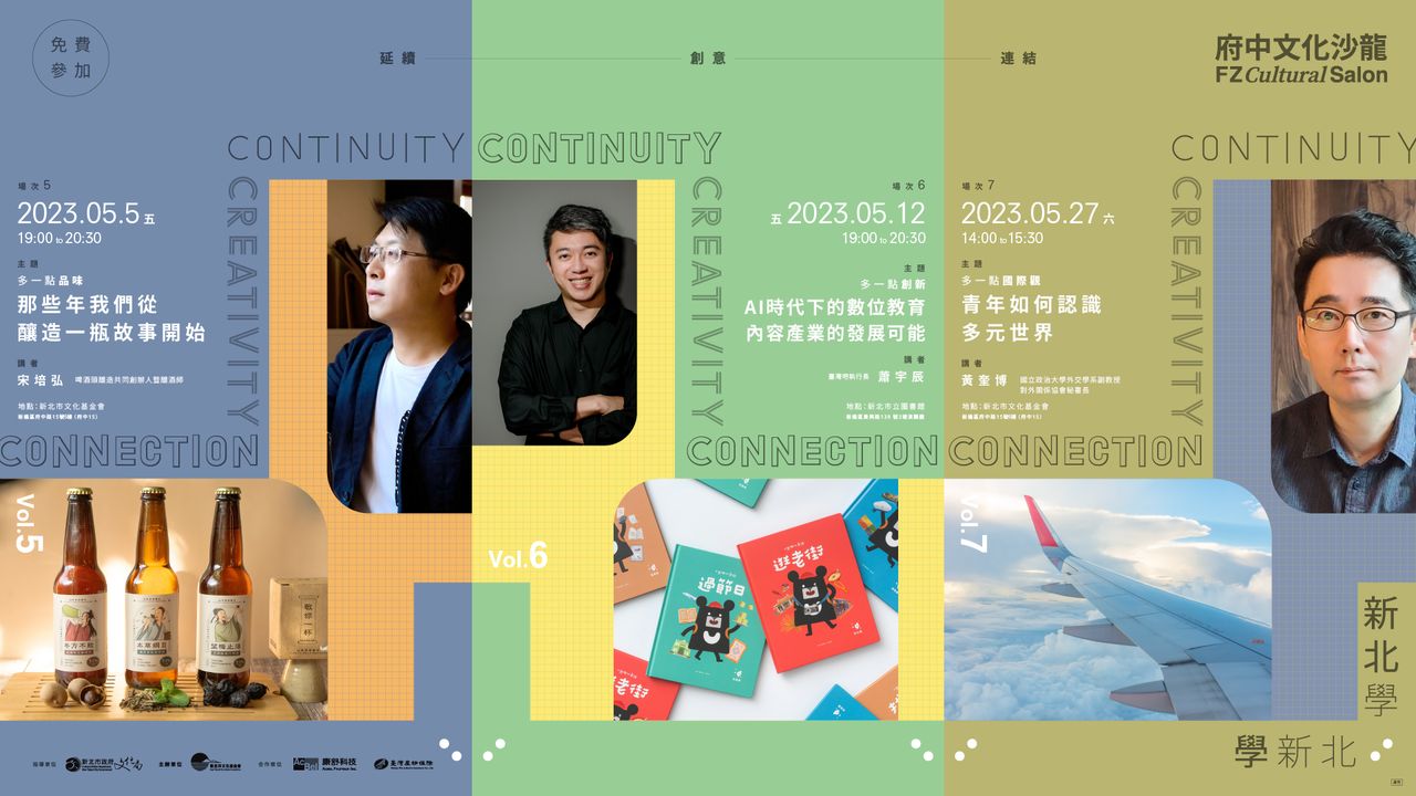 新北市文化基金會積極打造多元議題學習的平台,與臺灣產物保險股份有限公司、康舒科技股份有限公司合作辦理「2023府中文化沙龍講座活動」。5月份場次專為青年設計規劃,有青年創業的啤酒頭共同創辦人宋培弘,談釀酒的理性與感性;青年經營的臺灣吧執行長,談數位教育發展;政大外交系副教授暨對外關係協會秘書長黃奎博,談青年國際視野。