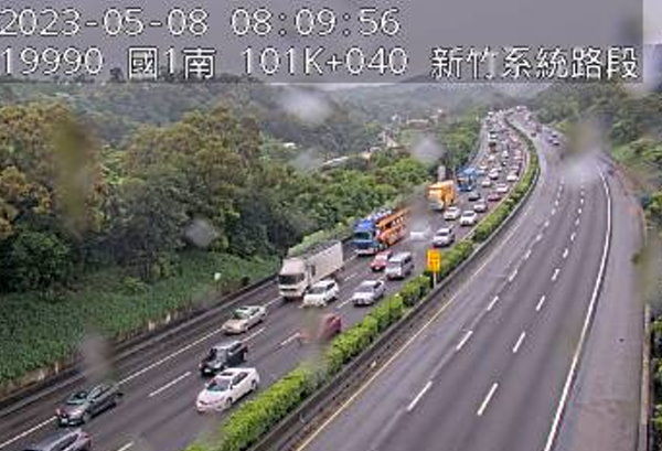 ▲車流回堵中。(圖/翻攝高公局網站)記者陳俊宏/綜合報導高公局表示,今天(8日)早上7時35分,國道1號北向99.4K、新竹路段,發生一輛大貨車、兩輛自小客車追撞占用內側2線道事故,回堵5公里。