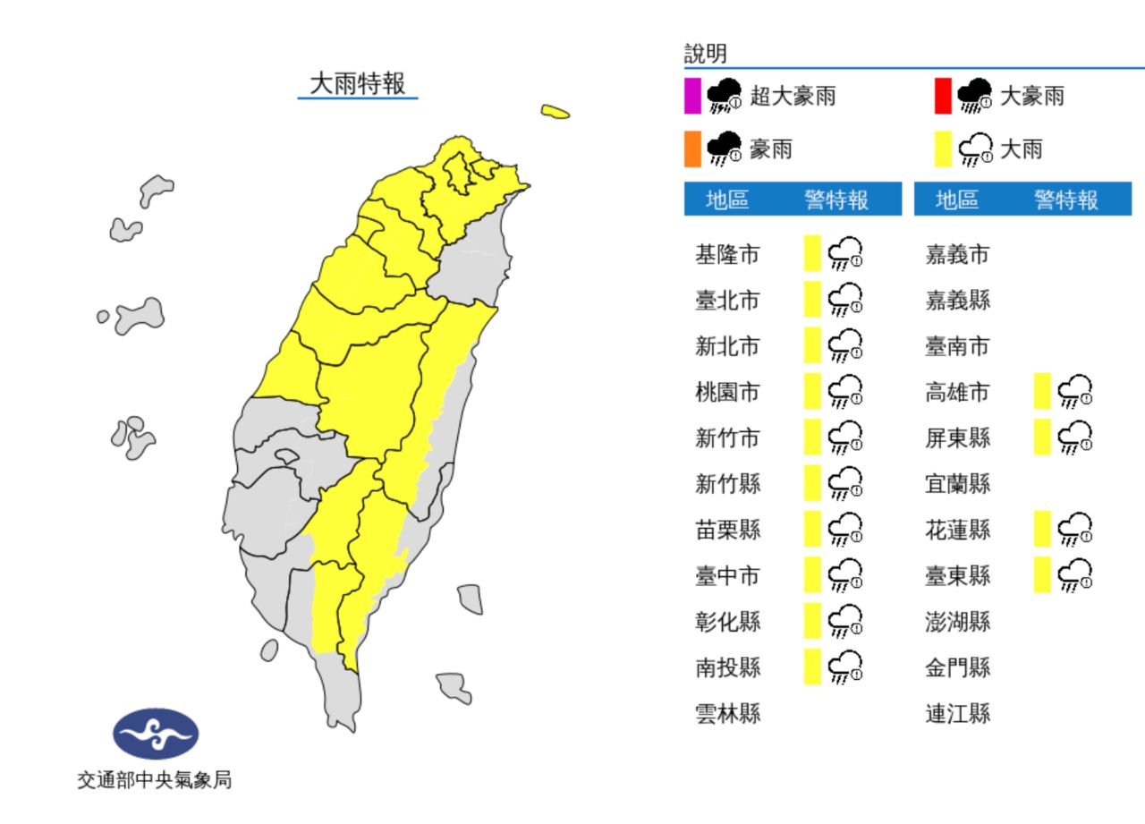 氣象局指出,今天鋒面通過並逐漸遠離,鋒面附近水氣偏多,各地易出現降雨,清晨彰化以北地區及高屏、臺東山區有局部大雨發生,預計今日下半天起水氣減少,各地降雨將逐漸趨緩。