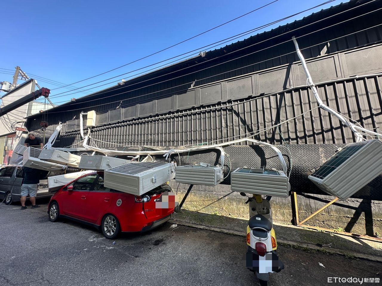 ▲▼ 冷氣與鐵架重重壓毀轎車,店家趕緊請施工單位前來吊起。(圖/記者許權毅攝)