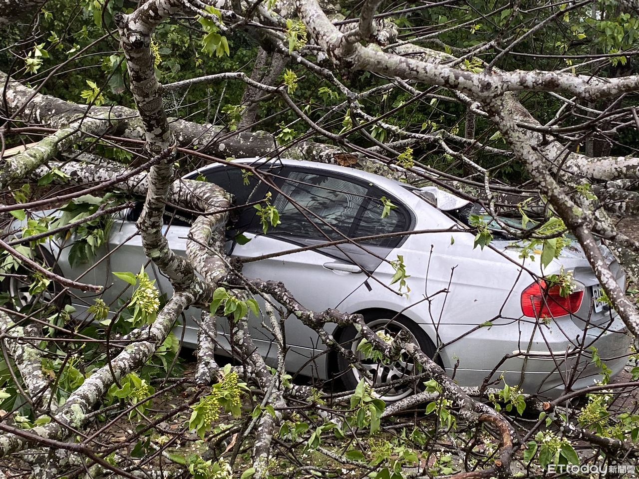 ▲雲林古坑油桐花樹倒塌壓毀BMW。(圖/記者蔡佩旻翻攝,下同)