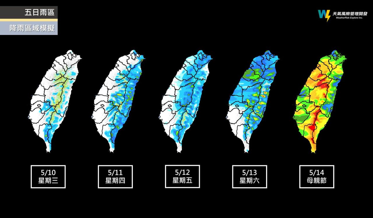母親節全台雷雨!氣象專家吳德榮提醒,周六晚起中部以北轉有局部短暫雨;周日梅雨季第2波「移動性鋒面」影響,各地轉有局部陣雨或雷雨,有較大雨勢發生的機率。天氣風險公司也分享未來5天雨區模擬圖提到,周日有一波降雨。