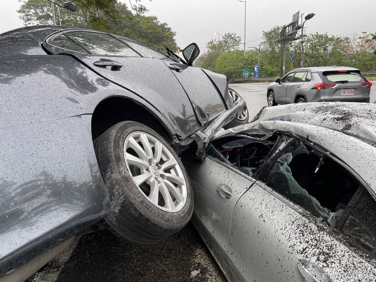 嘉義縣民雄鄉大崎村166線二高北上引道路口,8日發生一起恐怖車禍,一輛黑色Lexus小客車由西向東駕駛時,因為路面積水打滑,撞上邊坡後翻滾撞上在二高引道等紅燈的白色賓士車,由於遭高速翻滾撞擊,整輛Lexus幾乎全毀,雙方駕駛及賓士車上1名乘客。