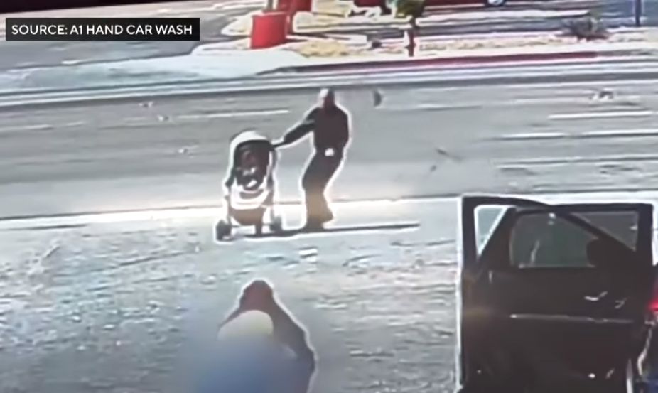 ▲婦女不小心跌倒,嬰兒車滑向大馬路。(圖/翻攝推特@USSGoodGirl)