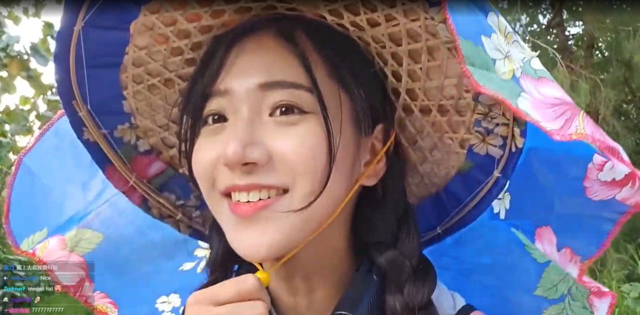 ▲企鵝妹收到客家花布斗笠,竟然完美駕馭「客家細妹風穿搭」。(圖/翻攝自企鵝妹Twitch)