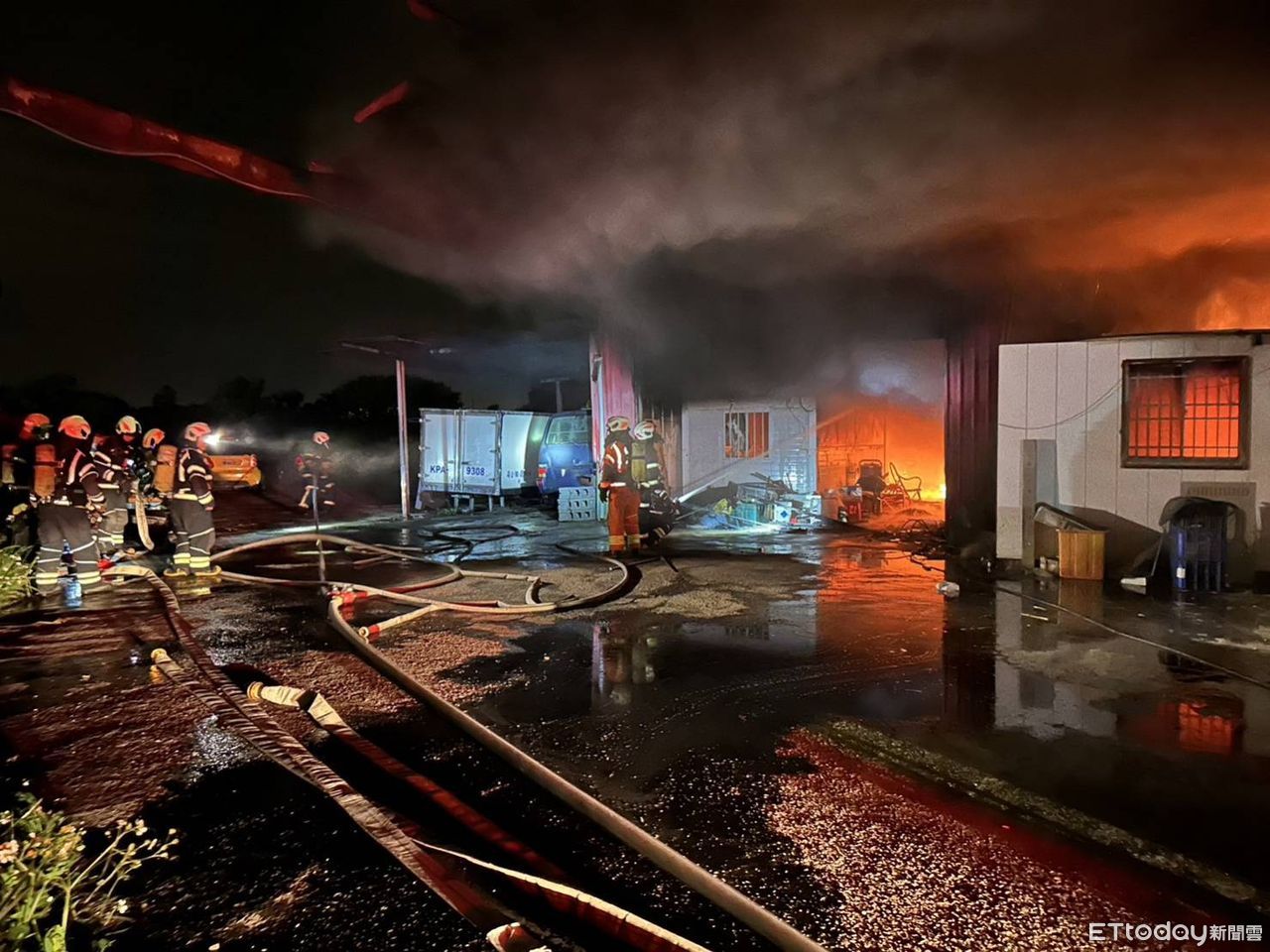 消防局2時47分獲報,現場為一棟2層樓鐵皮建築,1樓車庫起火,出動63名消防人員、26輛消防車及1輛救護車。