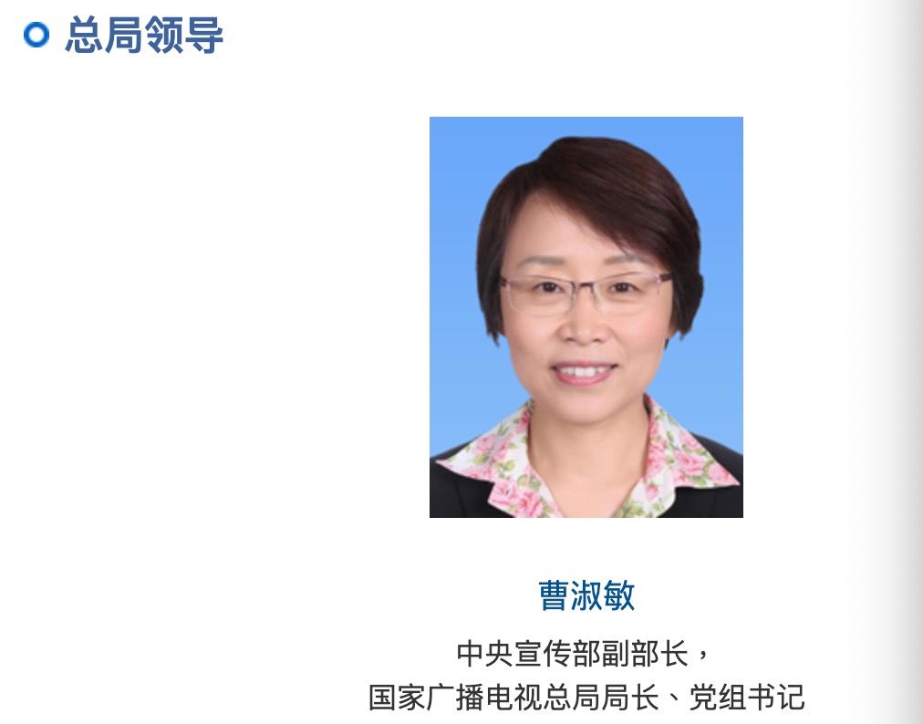 根據大陸國家廣播電視總局官網更新領導信息:曹淑敏,女,漢族,1966年7月出生,博士研究生,中共黨員,現任二十屆中央候補委員,中央宣傳部副部長,國家廣播電視總局局長、黨組書記。