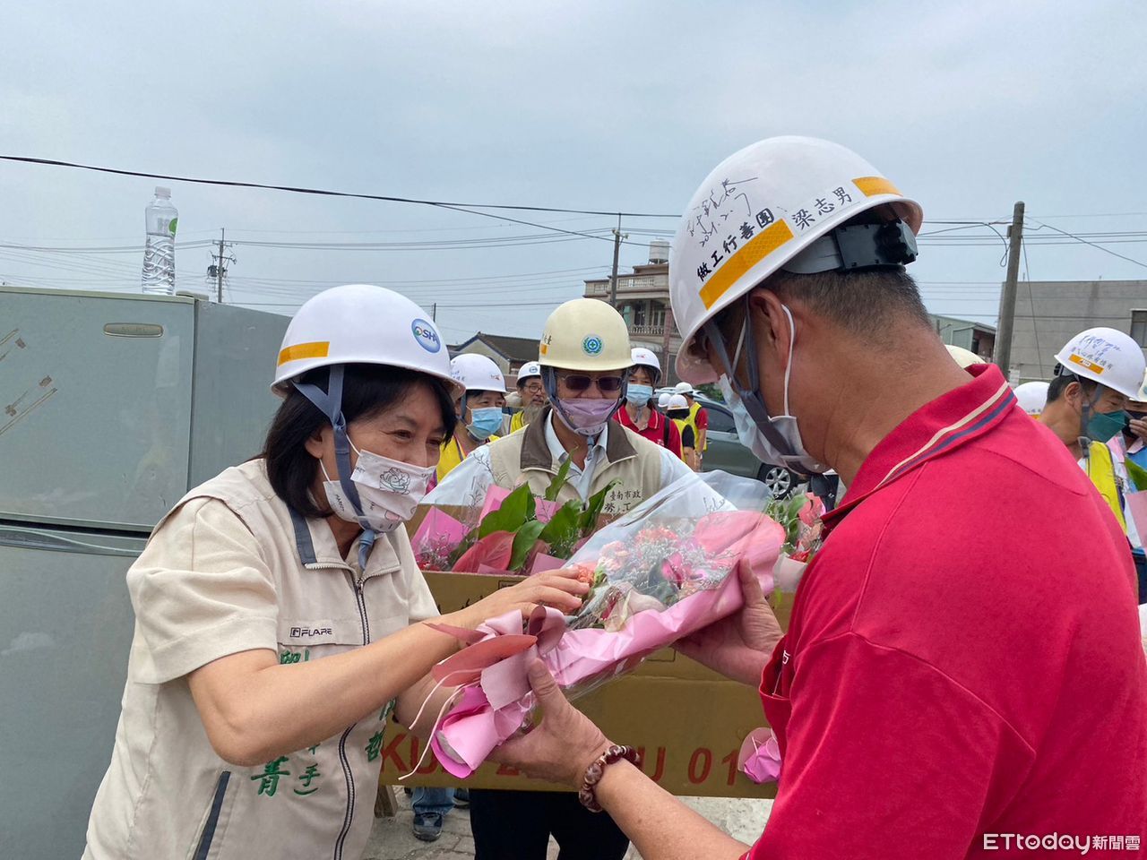 ▲台南做工行善團14日母親節,前往學甲區完成第211戶房屋修繕相關作業,市長夫人劉育菁女士,特別代表黃偉哲市長帶來康乃馨慰勞志工。(圖/記者林悅翻攝,下同)