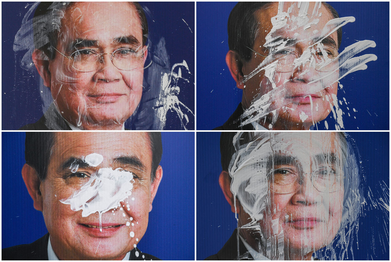 ▲張貼在曼谷的泰國總理帕拉育(Prayuth Chan-ocha)競選海報,於4月14日潑水節期間遭人以顏料塗抹。(圖/路透)