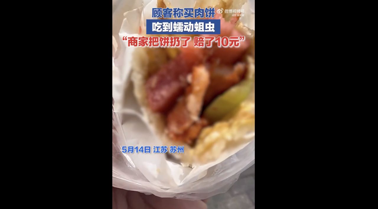 江蘇蘇州市一名男子近日購買一個肉餅,咬下一口後驚覺有活蛆在裡面爬動。對此,他向店家投訴反映,然而店家卻只將餅丟掉並象徵性的賠償10元人民幣(約44元新台幣),讓這名男子相當不滿,遂將影片貼到網路上,怒批店家處置不當。