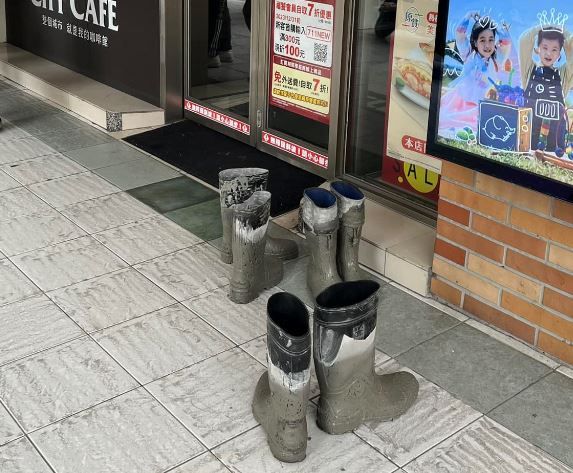 ▲門口放了「3雙沾滿水泥雨鞋」。(圖/翻攝自Facebook/路上觀察學院)