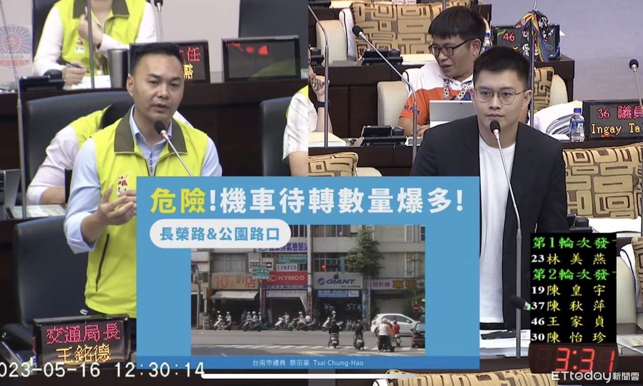台南市議會16日進行交通局業務報告及質詢,市議員蔡宗豪點出在公園路和長榮路口之機車待轉區,根本如同「待撞區」,眾多機車騎士反映,在該路口待轉時好可怕,尤其上下班時間,待轉區都不夠機車停車待轉,面對直行車輛通行時十分危險。