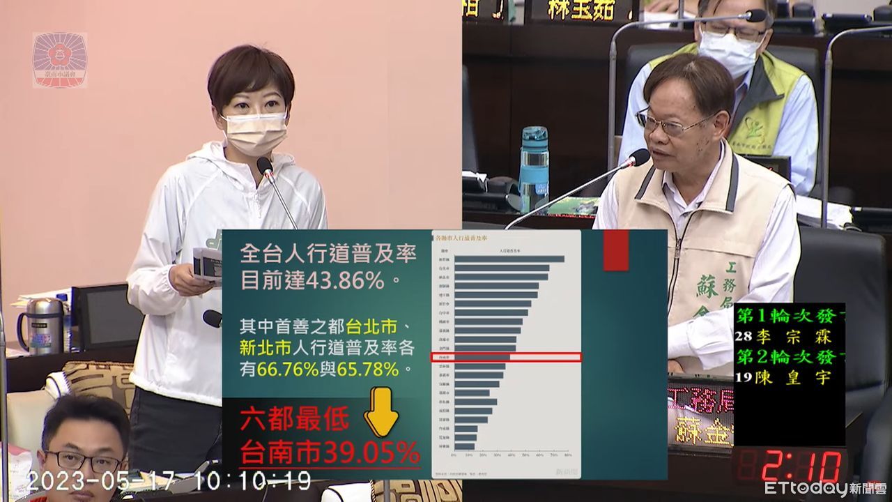 ▲台南市議員陳怡珍表示,目前全台人行道普及率達43.86%,台北市、新北市人行道普及率各有66.76%與65.78%,六都最低的是台南市39.05%。(圖/記者林悅翻攝)