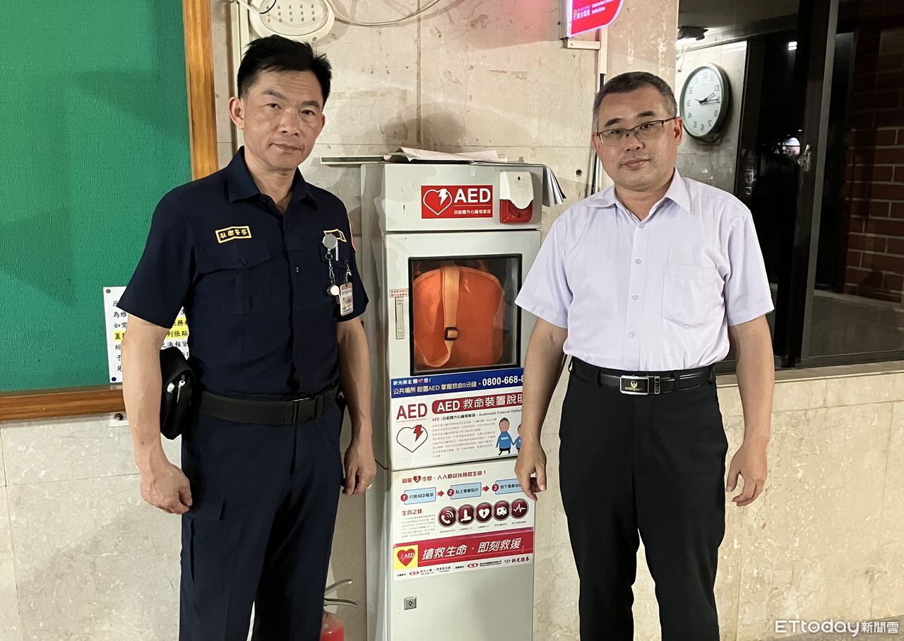 ▲▼患者在報案後倒地,曾志明和吳聲煌趕快拿起一旁的AED電擊器過去幫忙。