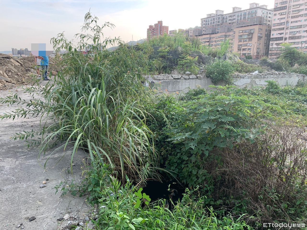 ▲新北塭仔圳工地水坑驚見男屍,臉部已腐爛。(圖/記者戴上容翻攝)