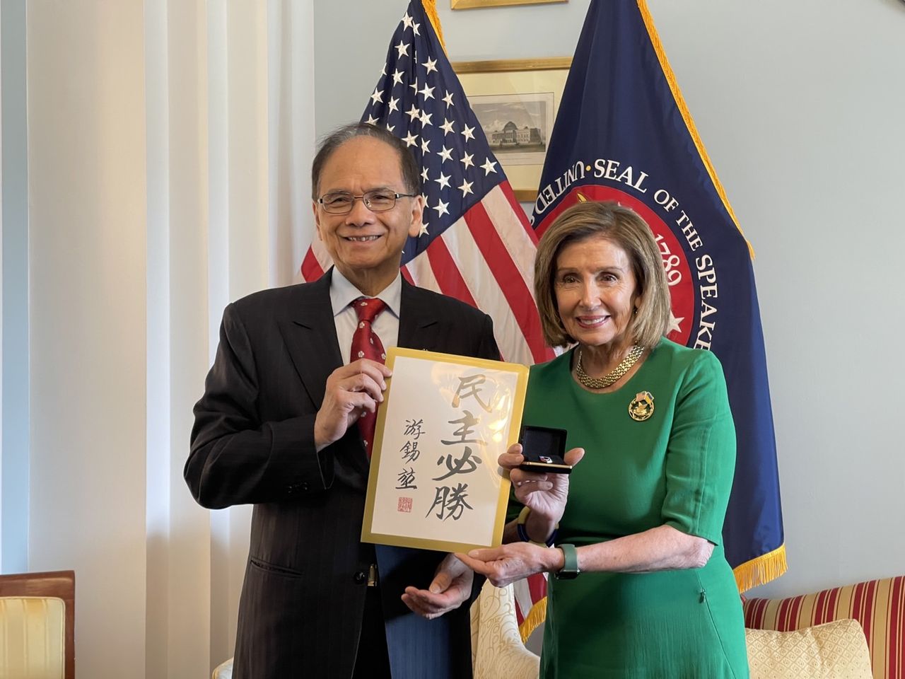 ▲游錫堃致贈「民主必勝」題字給裴洛西。(圖/立法院提供)