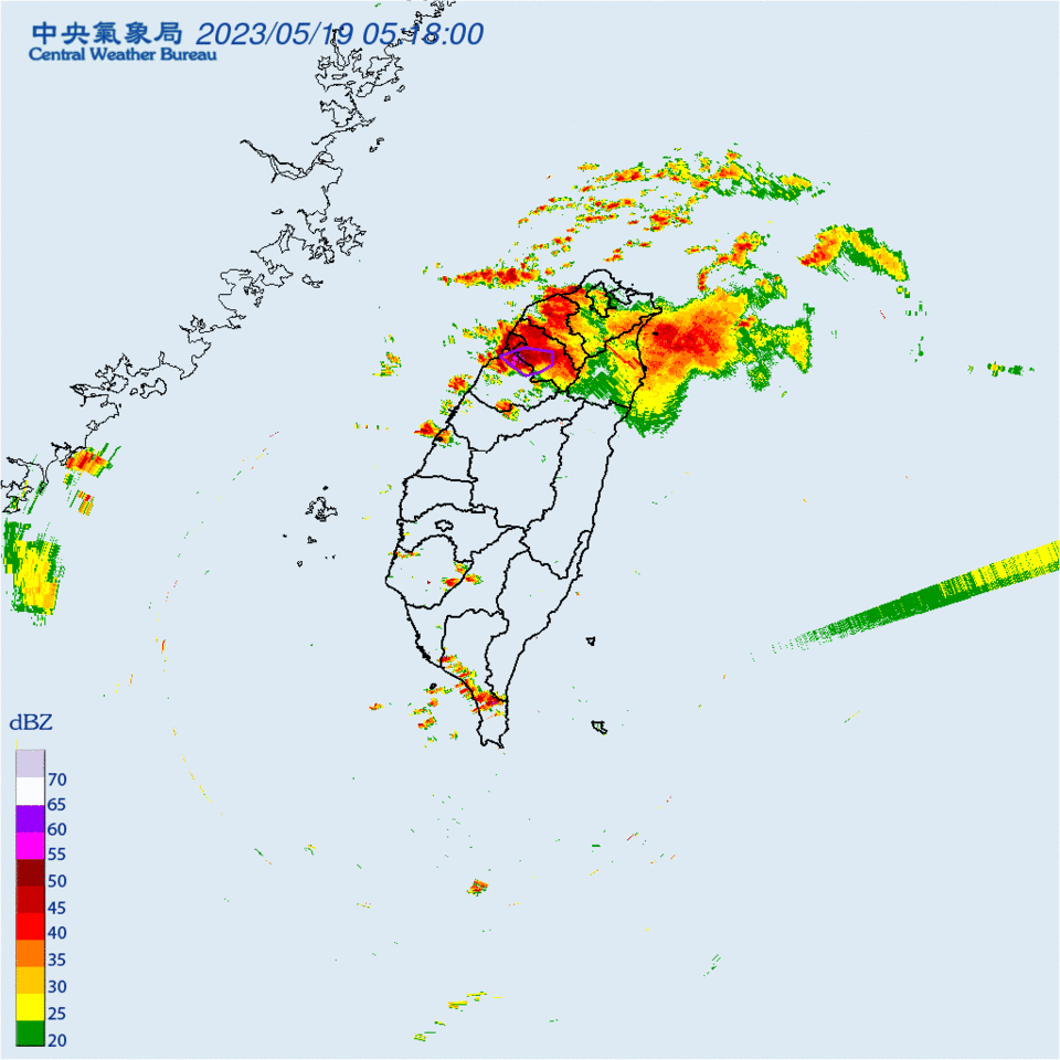 今(19)日鋒面影響,降雨機率提高,偶有小範圍強對流發展,伴隨「劇烈天氣」(雷擊、強風、瞬間強降雨),需注意即時訊息;各地氣溫略降,北台稍轉涼。各地區平地氣溫:北部20至28度,中部22至31度,南部22至32度,東部20至32度。明日、下週日(20、21日)鋒面東移,大氣仍不穩定,西半部有局部陣雨,偶有較大雨勢。