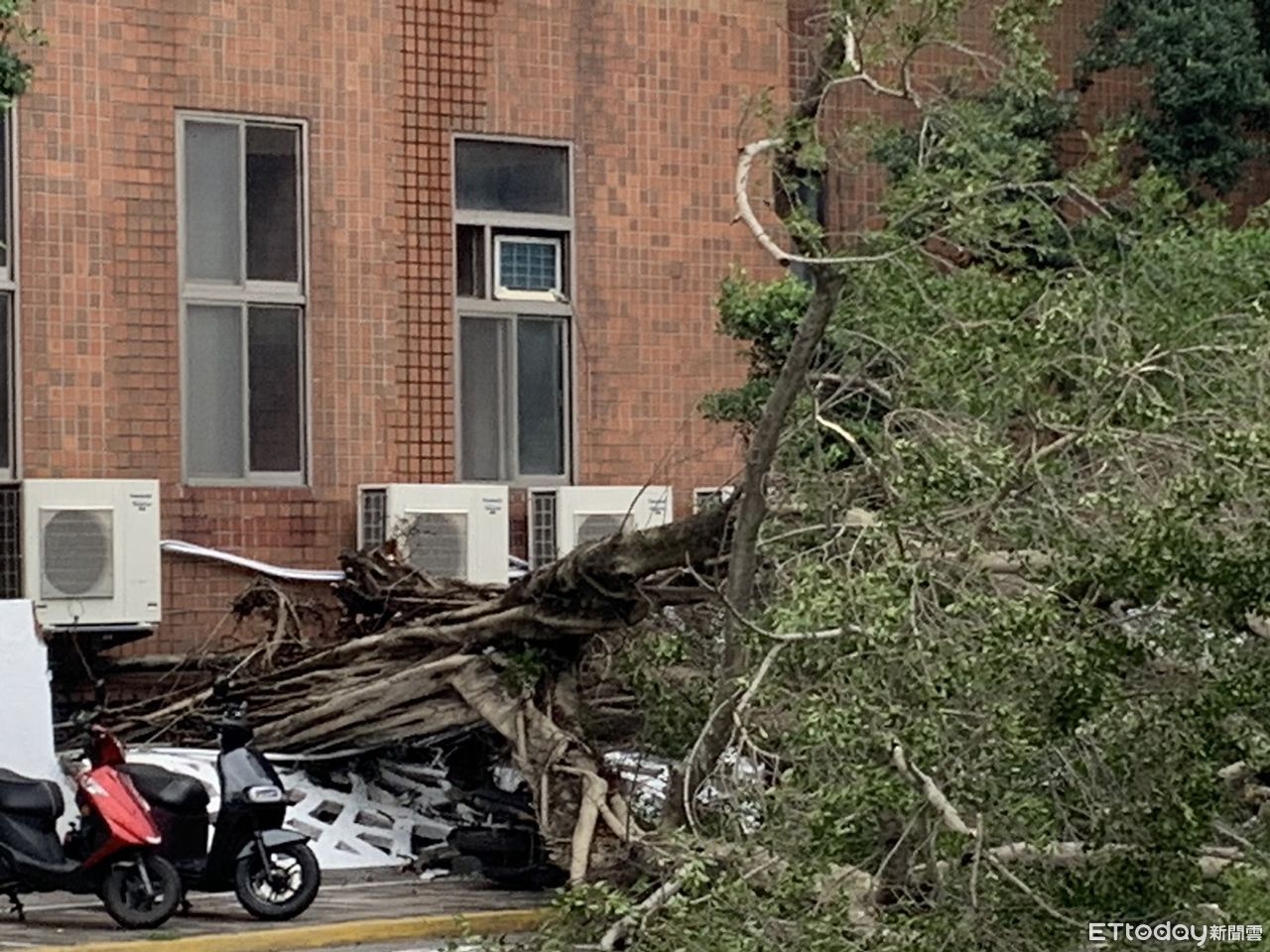 台北地區昨晚受到強烈雷雨帶襲擊,出現強降雨,今日下午近3點,台北市博愛特區位於重慶南路一段上法務部正門口,突然發出碰巨響,一時間以為是爆炸或是車禍,原來是台北市立教育大學側門圍牆內的老樹轟然技根倒下,學校圍牆遭樹壓也整片倒下,停在人行道上的數量機車也被老樹壓倒,重慶南路一段二個線道交道受到影響,僅能單向行車。