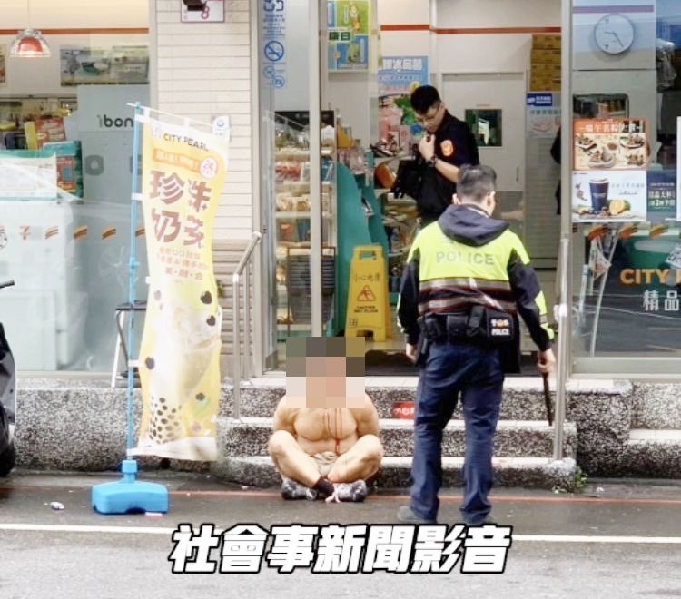 ▲身材壯碩的朱姓男子今天上午半裸上身在中壢區長沙路某超商,一度狀似哀傷模樣。(圖/翻攝自臉書《我是中壢人》)