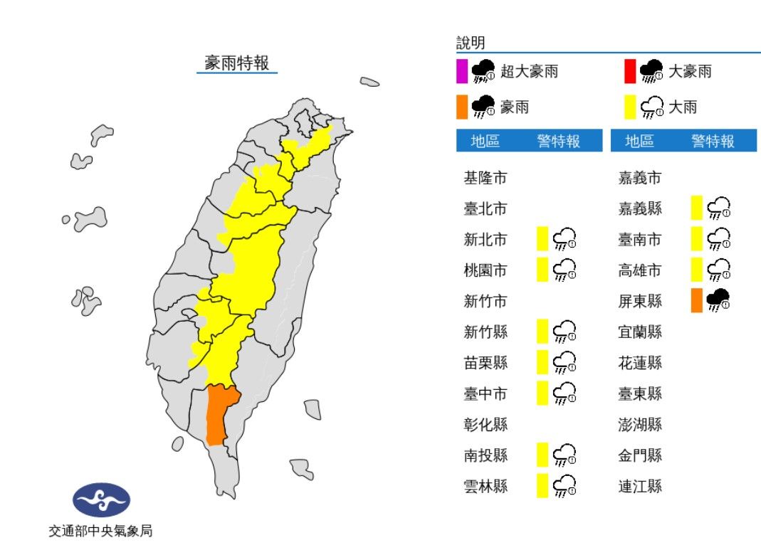 氣象局針對屏東縣發布大雷雨訊息及災害告警,預計大雷雨將持續至16時45分。此外,氣象局也針對11縣市發布豪大雨特報。
