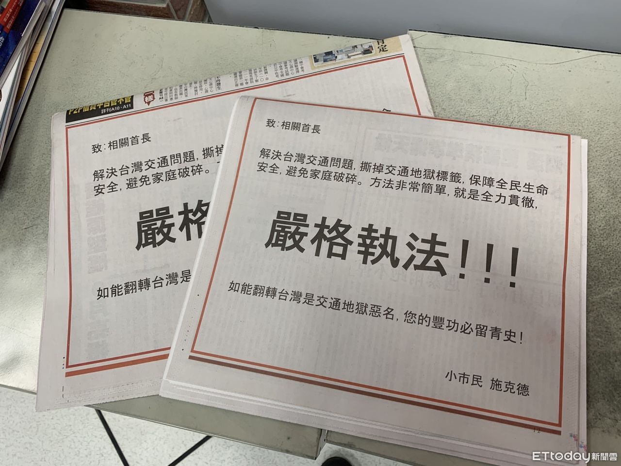 署名「小市民 施克德」的民眾今日買下自由時報、中國時報、聯合報三大報的頭版廣告,內容寫下「致:相關首長,解決台灣交通問題,撕掉交通地獄標籤,保障全民生命安全,避免家庭破碎。方法非常簡單,就是全力貫徹,嚴格執法!如能翻轉台灣是交通地獄惡名,您的豐功必留青史!」