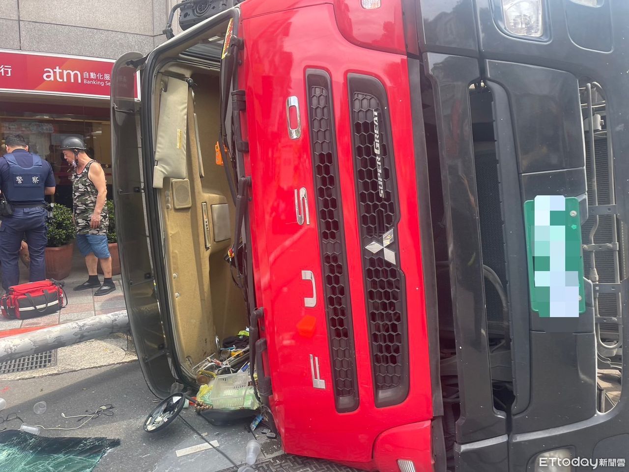 警方到場處理時,經查看,黃姓駕駛輕微擦挫傷,但因車輛翻覆,導致車身右側、車頭及車頂受損。事故發生後,水泥流溢騎樓,銀行門口瞬間鋪滿水泥,1輛無辜機車當場遭水泥「封印」。