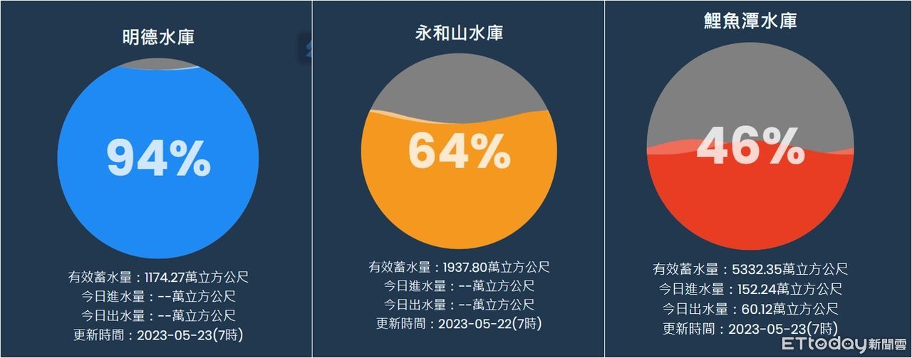 另外,鯉魚潭水庫目前有效蓄水量5332..35萬立方公尺,蓄水率46%;永和山水庫有效蓄水量1937.80萬立方公尺,蓄水率64%。
