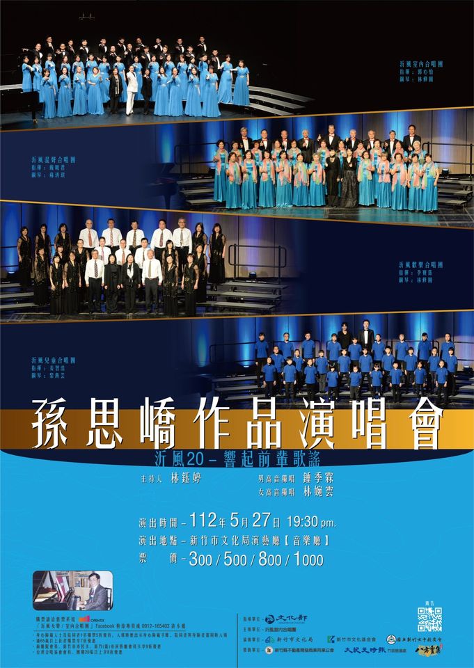 新竹市傑出演藝團隊「沂風室內合唱團」,致力透過歌聲推廣在地文化,今年欣逢成團20週年,精選年近90歲的在地作曲家孫思嶠老師作品,本周六(27日)晚間7時30分,於新竹市文化局演藝廳舉辦「《沂風20—響起前輩歌謠》孫思嶠作品演唱會」,透過沂風家族6組合唱團老中青3代逾百人的歌聲,再現資深愛樂者的童年記憶,歡迎購票入場(opentix.life/event/1631581050159411204)。