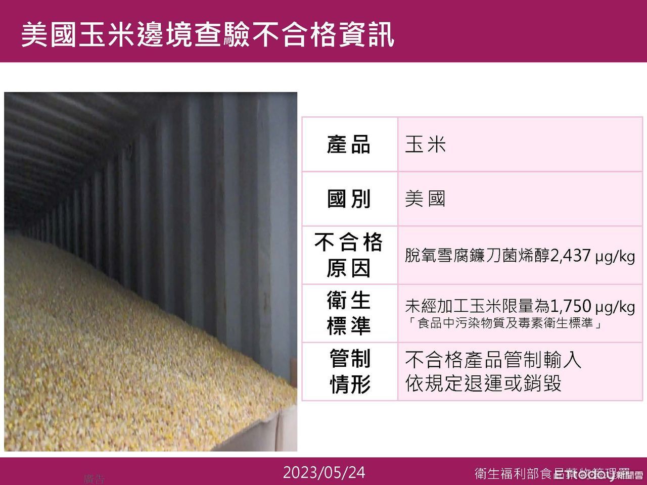 林金富說明,昨日邊境查驗公佈有美國進口玉米驗出「嘔吐毒素」,為我國首次驗出不合格情形,該家輸入業者在高雄市路竹區,是以食品方式輸入,再進到食品工廠內作為動物飼料使用。該批產品全於邊境遭退運或銷毀,不會流入市面。