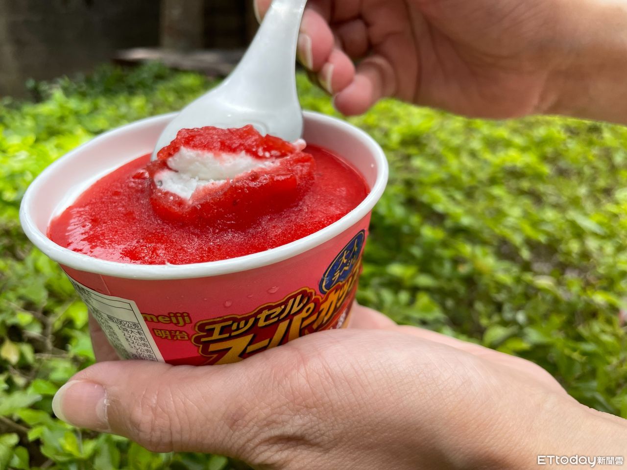 ▲7-11獨家販售大人系口味「明治超級杯冰淇淋-奢華草莓」。(圖/記者周姈姈攝,下同)