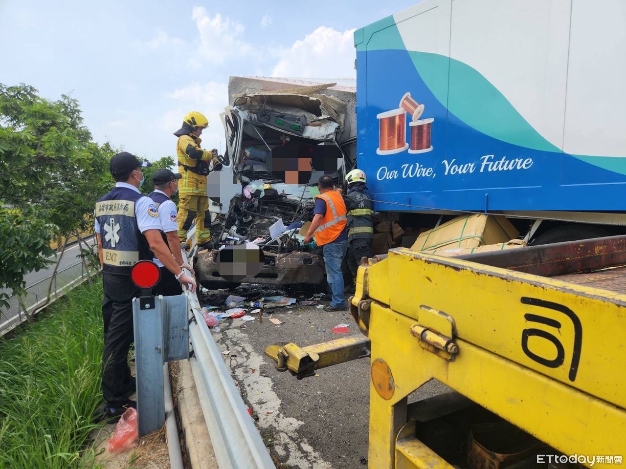 這起事故發生在25日下午1時50分左右,現場4部大車撞成一團,初步了解,因洪男未注意車前狀況,先追撞黃男所開的大貨車後,又再向前推撞前方大貨車、曳引車。