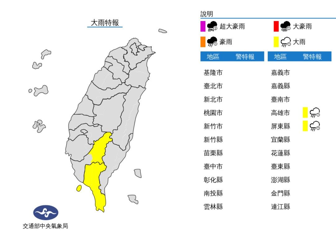 大雨:高雄市山區、屏東縣、恆春半島