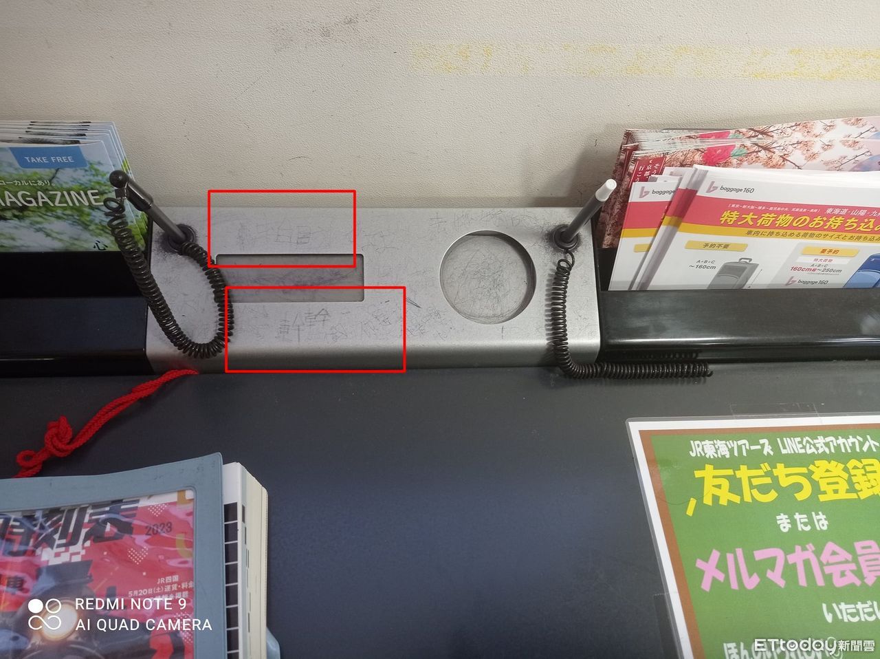 只見車站有一處桌子放置旅遊資訊,並提供原字筆給旅客填寫資料;怎料,銀色筆座上竟布滿塗鴉,甚至出現國罵「白目」、「幹」等字眼。
