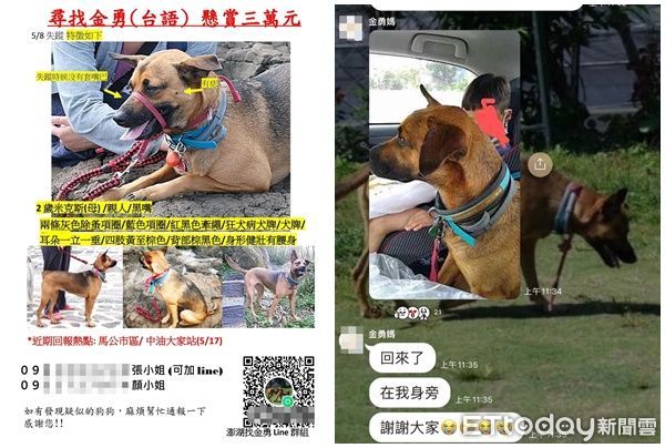 消息一出,隨即在澎湖當地傳開,許多熱情鄉親也加入金勇媽創立的LINE群組「澎湖找金勇」,隨時協助更新最新進展,這也一度成為澎湖當地的全民尋狗運動,焦急的金勇媽還將賞金從1萬提高到3萬,希望心愛的寶貝能早日平安回到身邊。