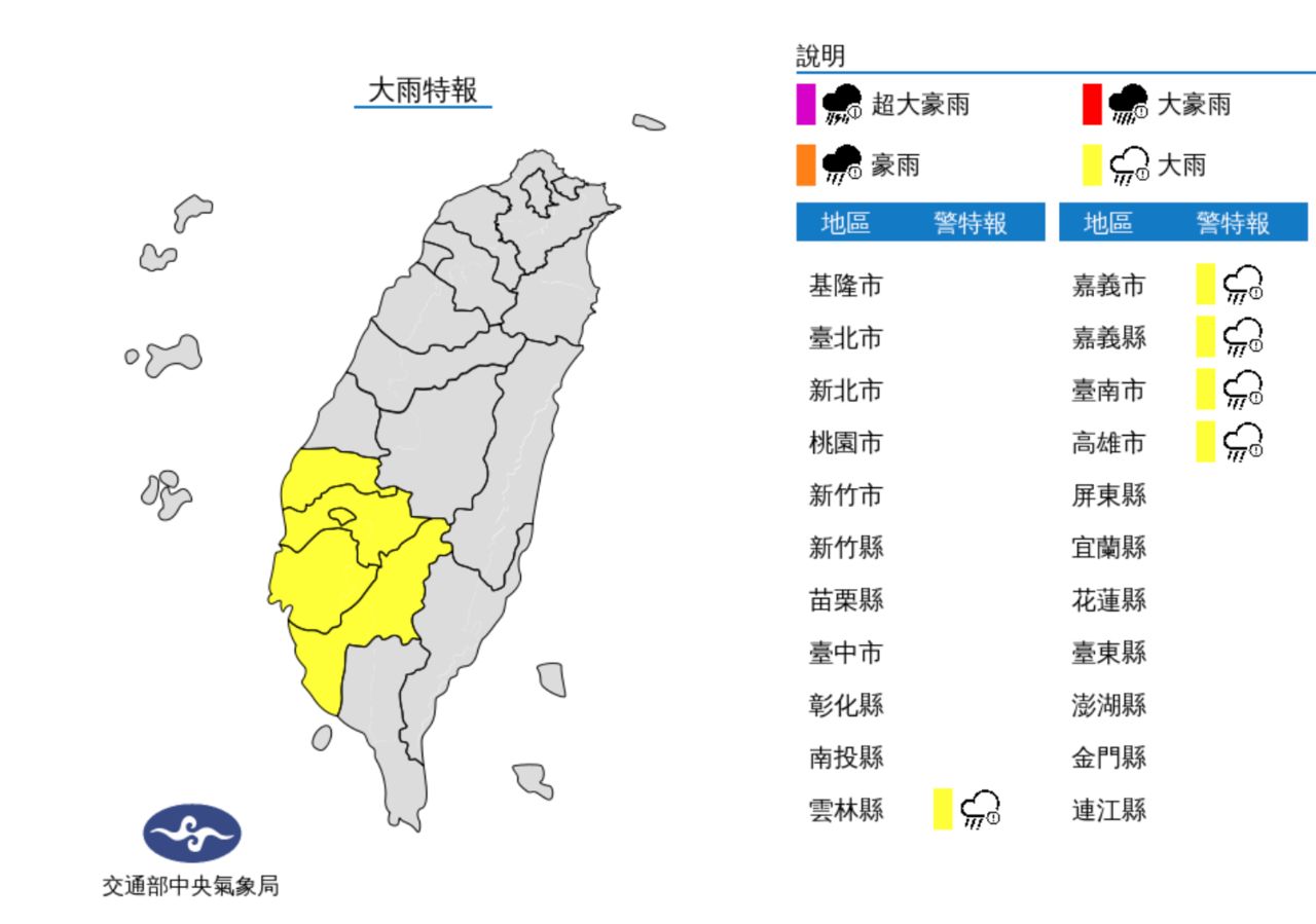 *大雨:雲林縣、嘉義市、嘉義縣、臺南市、高雄市