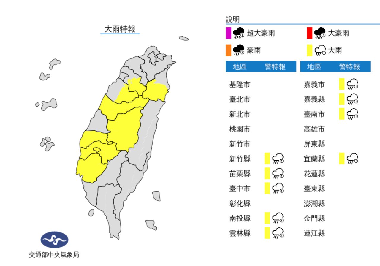 *大雨:新竹縣山區、苗栗縣山區、臺中市、南投縣、雲林縣、嘉義市、嘉義縣、臺南市、宜蘭縣山區