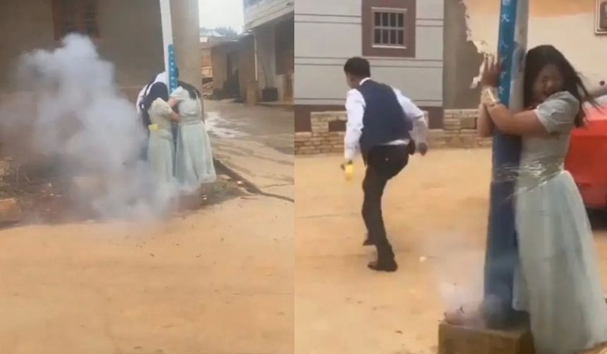 ▲雲南伴娘遭綁電線桿,腳下點鞭炮。(圖/翻攝自微博)