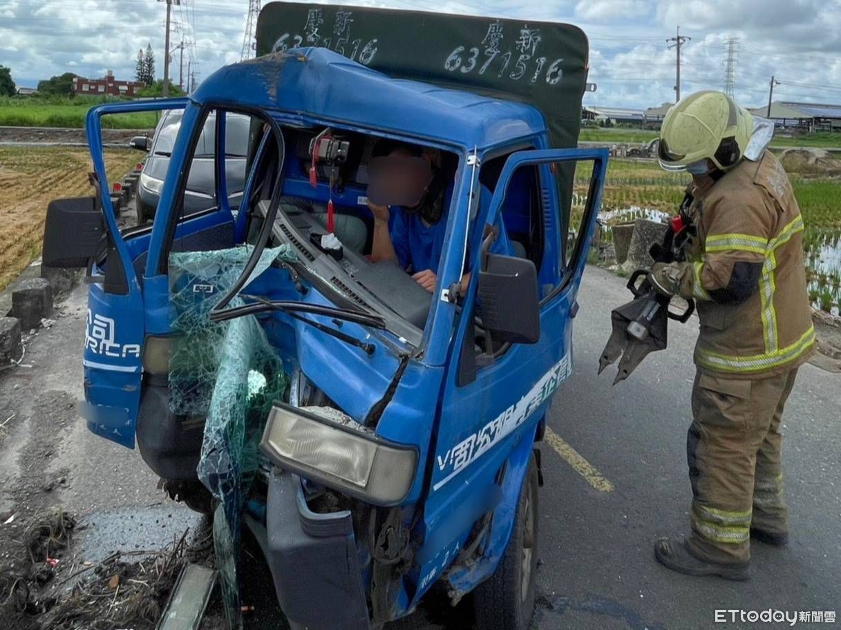 ▲陳姓男子駕駛自小貨車行經柳營區乳牛的家前面產業道路,疑打滑人車失控自撞電桿,陳男受困變形駕駛座內,消防人員搶救脫困。(圖/記者林悅翻攝,下同)