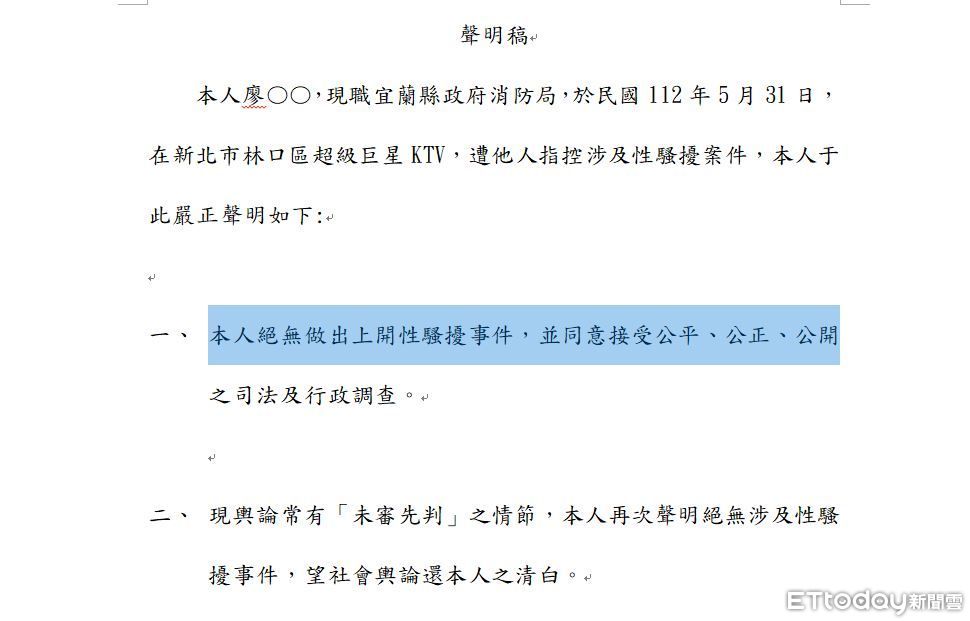 「本人廖〇〇,現職宜蘭縣政府消防局,於民國112年5月31日,在新北市林口區超級巨星KTV,遭他人指控涉及性騷擾案件,本人于此嚴正聲明如下:
