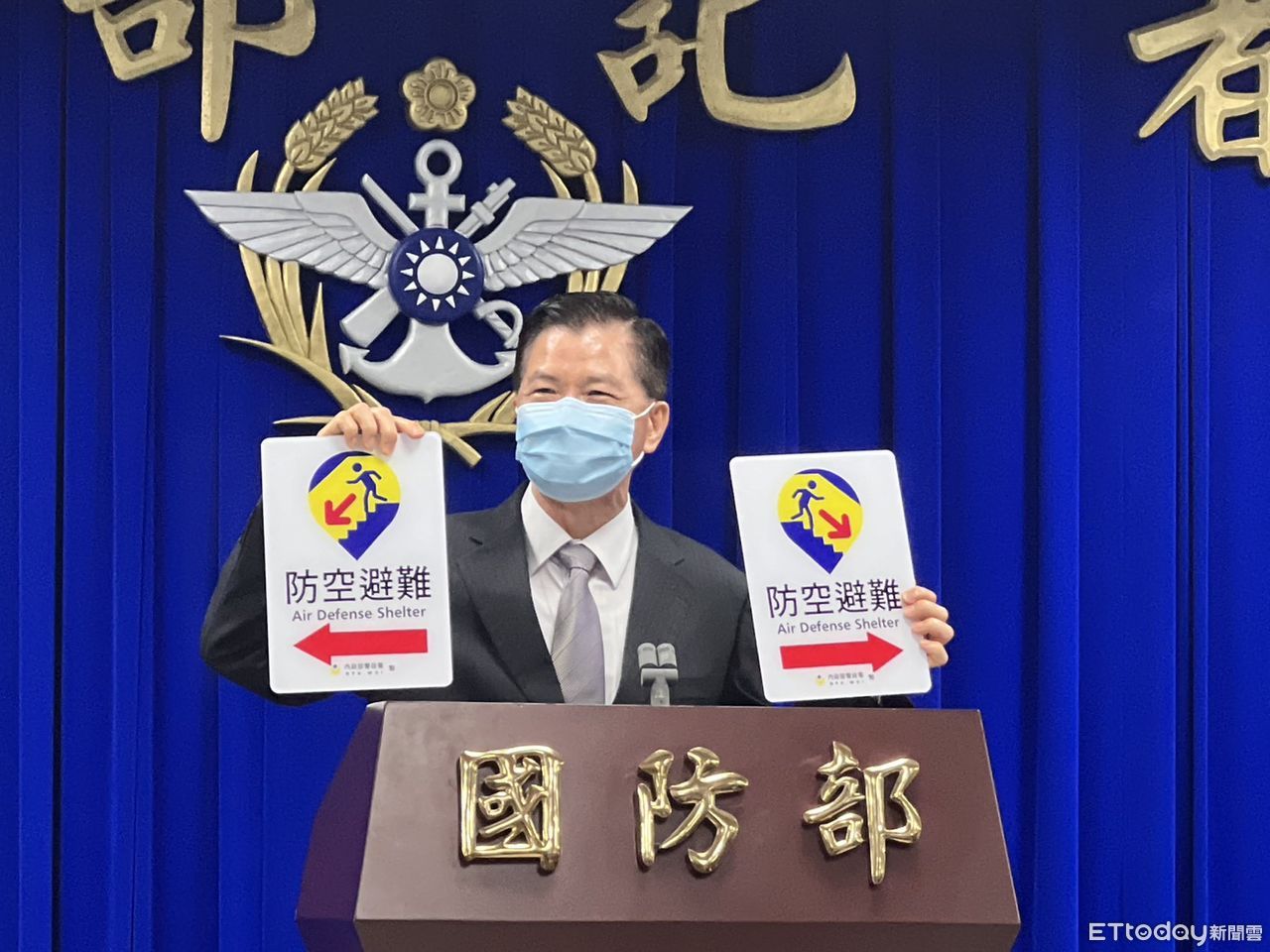▲林國華13日在國防部記者會上,手持壓克力材質的防空避難處所標示牌。(圖/記者蘇晏男攝)