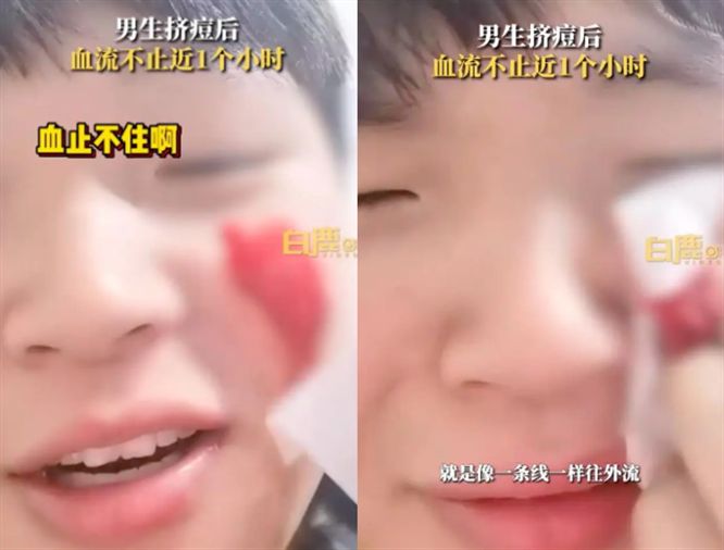 ▲男生擠痘血流不止近1小時。(圖/翻攝自白鹿視頻)